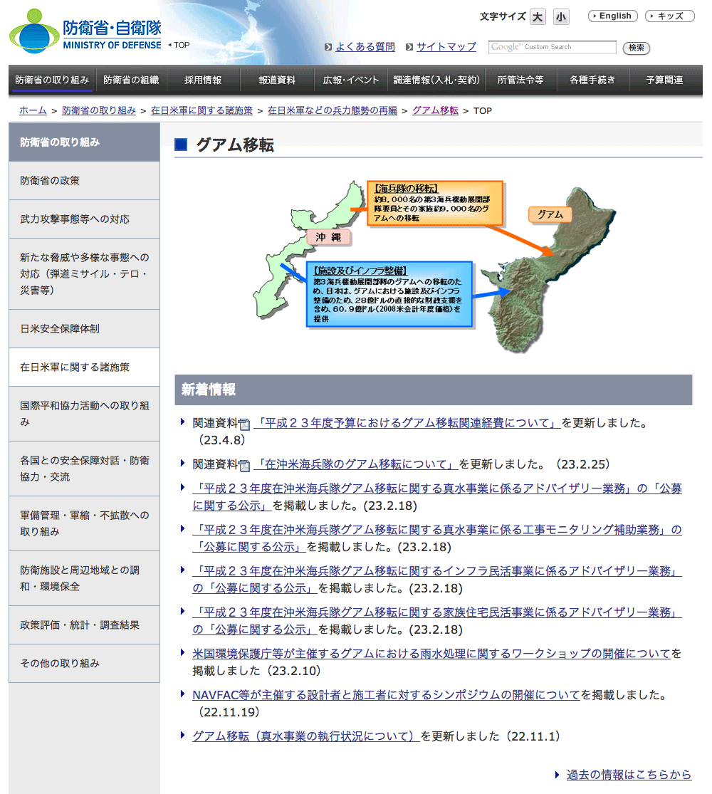 参考までに、先週のメールマガジンでも触れましたが、アメリカ政府がグアム移転費用の総額を水増しして日本の負担軽減を装い、日本政府もそれを認識していたという件に関しては、その公電をウィキリークスが朝日新聞に提供し、以下のページで紹介しています。