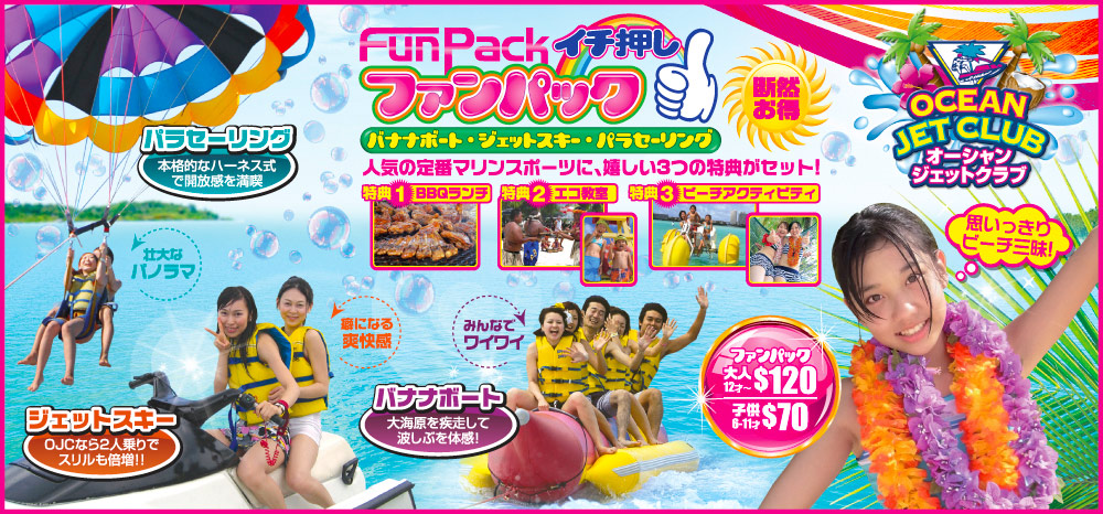 そんなOJCでのおすすめは、グアム三大人気のマリンスポーツである、バナナボート(30分1回)、ジェットスキー(30分1回)、パラセーリング(30分1回)がセットで楽しめる「ファンパック」。