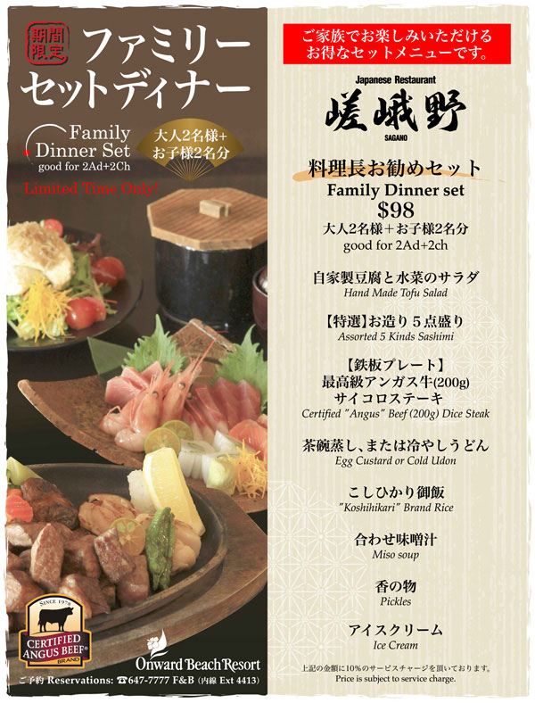 そんなご家族連れにオススメなのが、3月19日よりスタートした、嵯峨野(オンワードビーチリゾート内)の「ファミリーセットディナー」。大人2名+子供2名分のボリュームのセットメニューが、$98.00(+10%サービス料)で楽しめるお得なセットです。