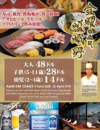 こちらのお店の一押しは、やはり金曜日。毎週金曜日の夜になると、鉄板焼きカウンターをフードラインに利用した食べ放題+飲み放題の、「金曜の夜は、嵯峨野」が開催されます。