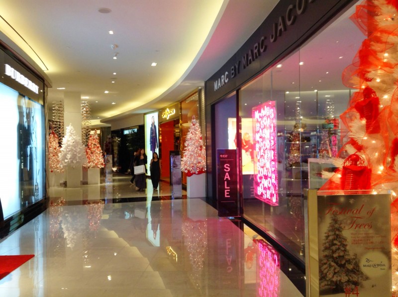 DFSギャラリアグアムの店内のあちこちに、赤と白のクリスマスツリーが飾られています。