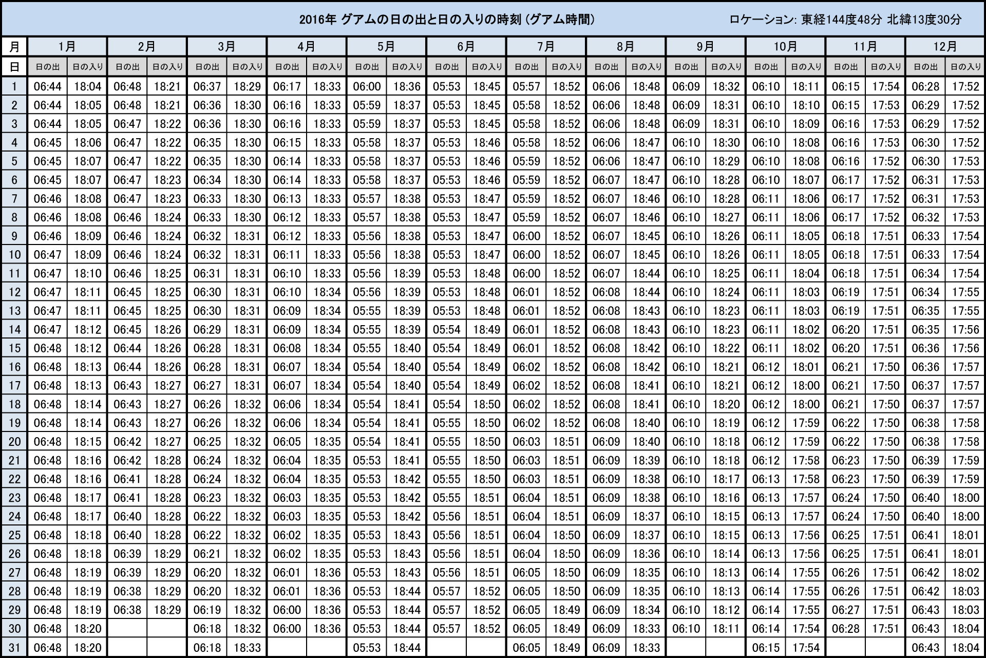 2016年の、グアムでの日の入りと日の出の時刻を、PDFファイルにまとめました。