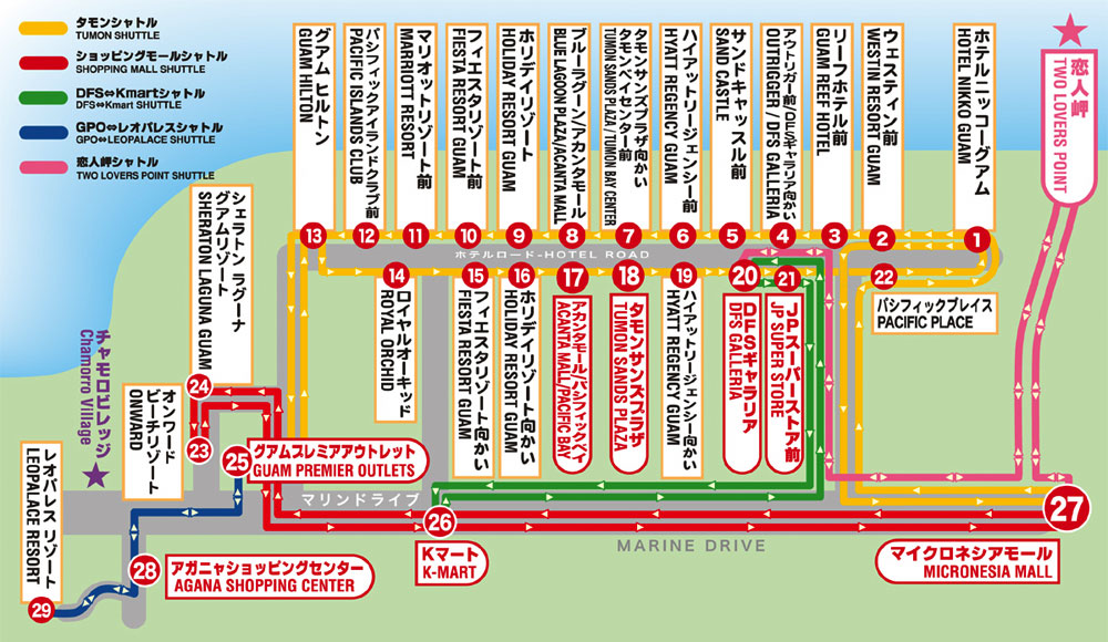 タモンエリアを巡回している「タモンシャトル」、グアムプレミアアウトレット、Kマート、マイクロネシアモールを結ぶ「ショッピングモールバス」、DFSギャラリアとKマートを結ぶ「DFS ←→ Kマートシャトル」、グアムプレミアアウトレットとレオパレスリゾートを結ぶ「GPO ←→ レオパレスシャトル」、毎週、水曜日の夜のみ運行する「チャモロビレッジナイトシャトル」、そして、DFSギャラリアと恋人岬、マイクロネシアモールと恋人岬を結ぶ「恋人岬シャトル」です。