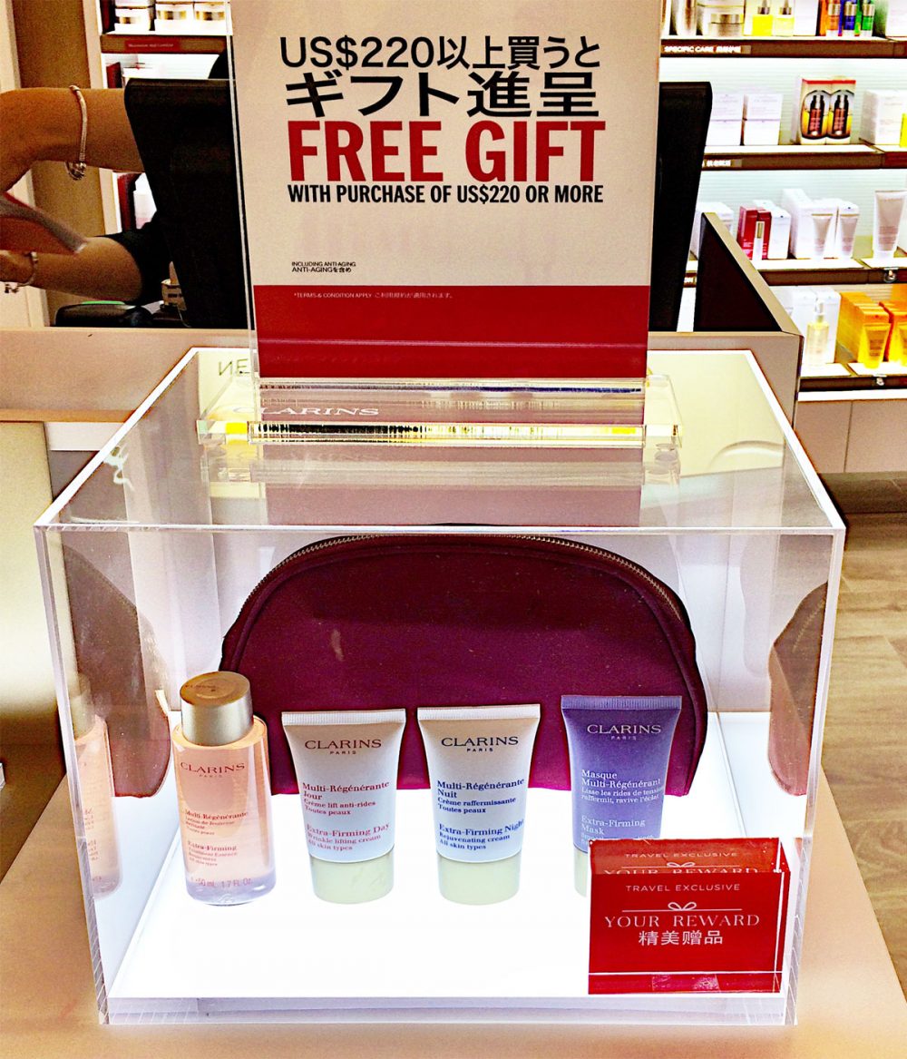 Tギャラリアグアムでは、DFS限定販売のWパックを販売中($177)、パッケージにはクラランスおすすめの試供品も入っています。