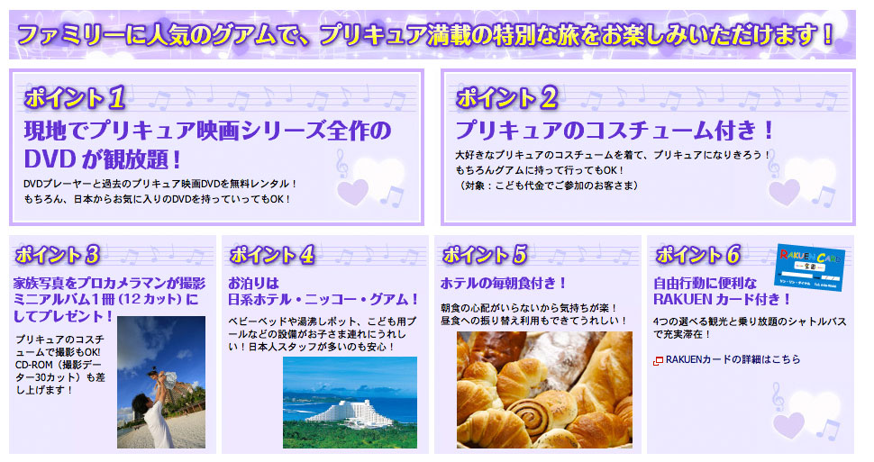 このツアーでは、過去の映画プリキュア10作品が、グアムに滞在中、DVDにて無料でレンタルできます。DVDプレイヤーも無料で貸してもらえるので、ホテルでプリキュア三昧も可能(なんとゼイタクな、、、)。
